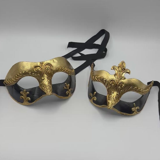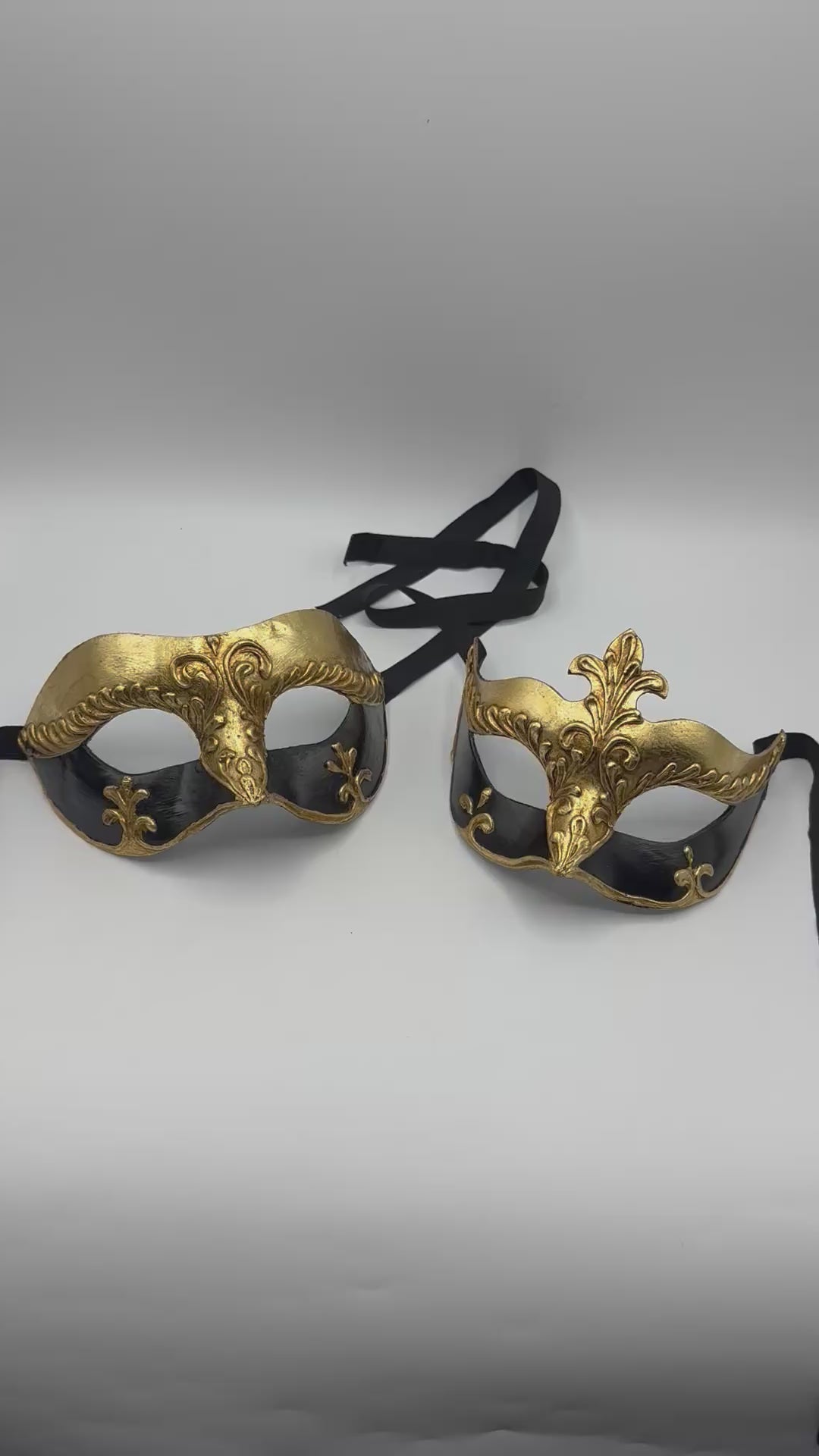 Both masks are handcrafted from papier-mâché and richly decorated with baroque-style golden details. Perfect for couples who want to shine together at a masquerade ball, gala, or themed event.