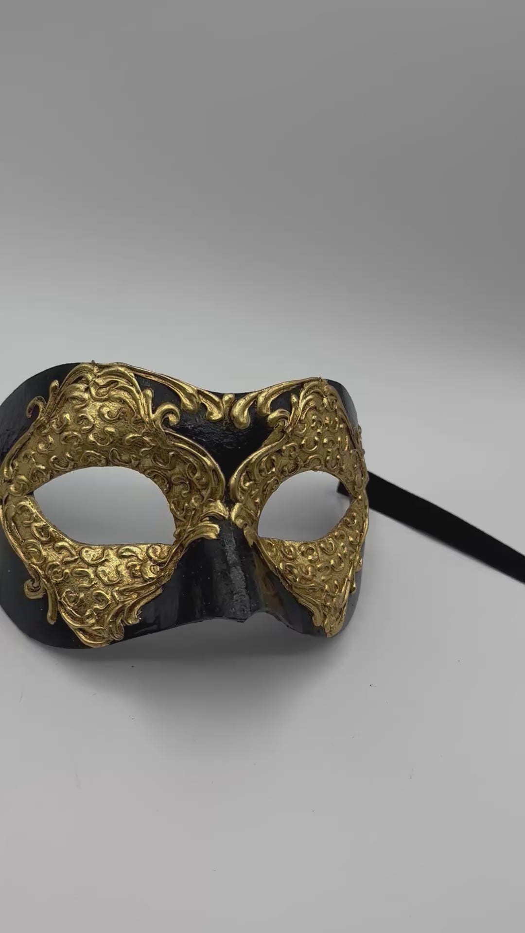 Hecha a mano con papel maché de alta calidad, esta máscara es ligera y cómoda de llevar. Se ajusta con cintas de raso negro, ofreciendo un acabado elegante y firme.