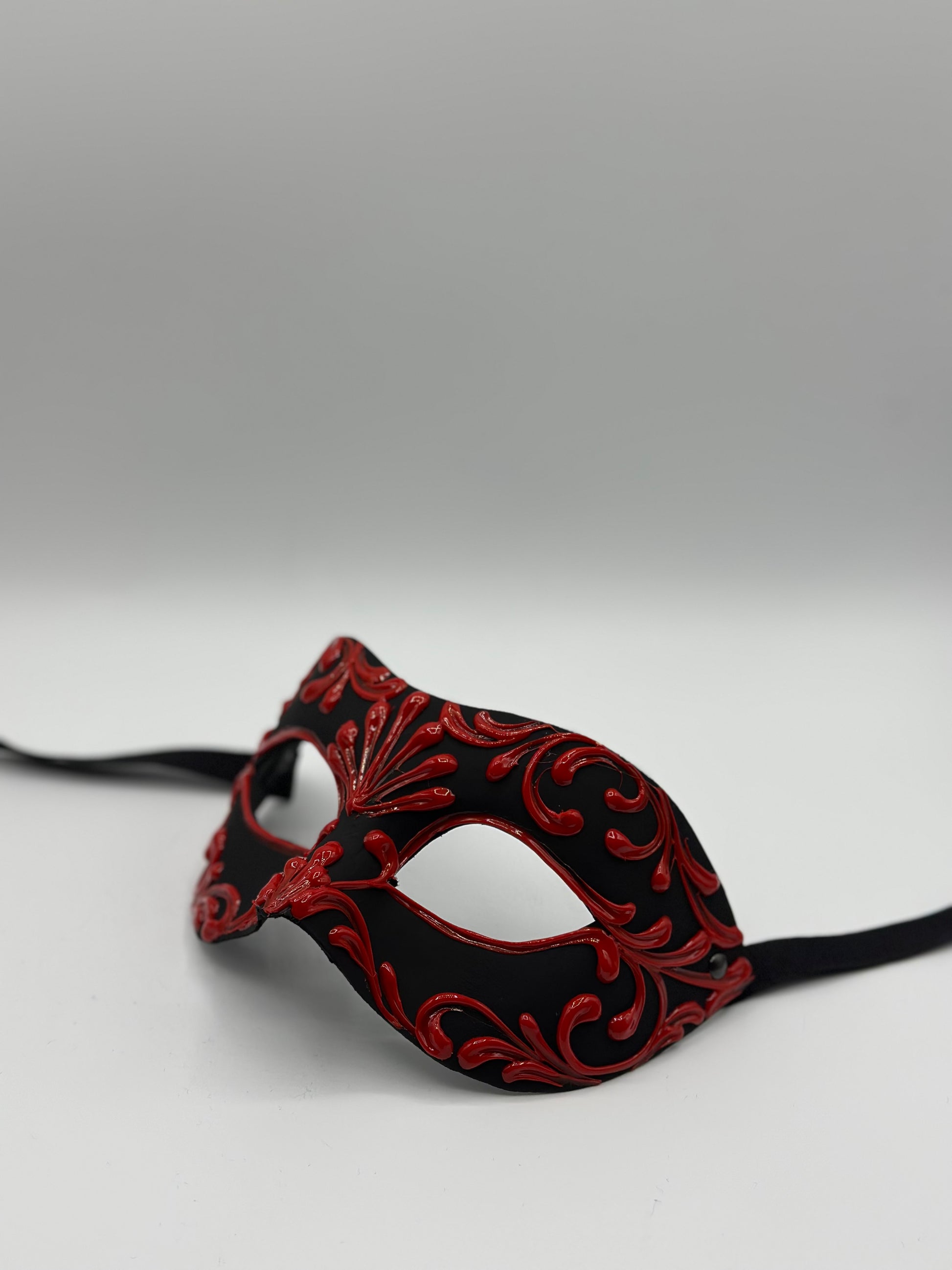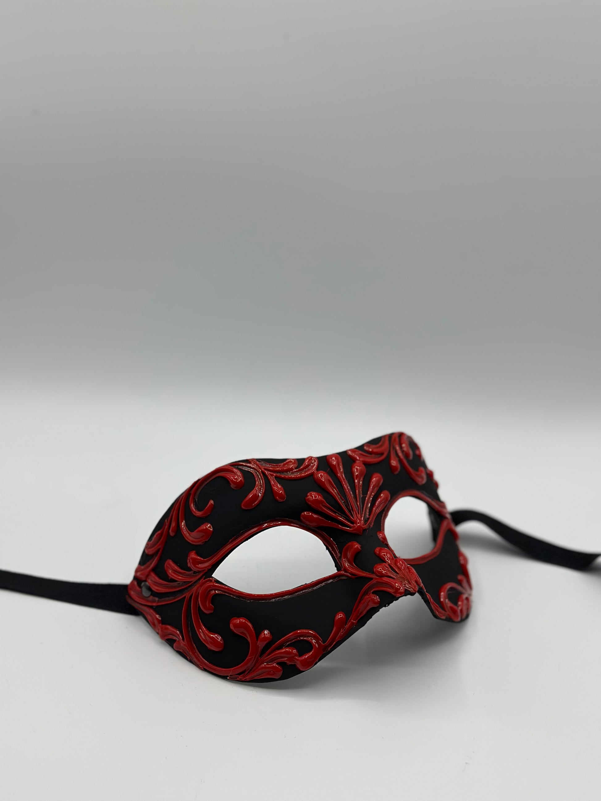 Añade un toque de misterio y elegancia a tu próximo evento con esta impresionante máscara veneciana hecha a mano en negro con detalles barrocos en rojo.