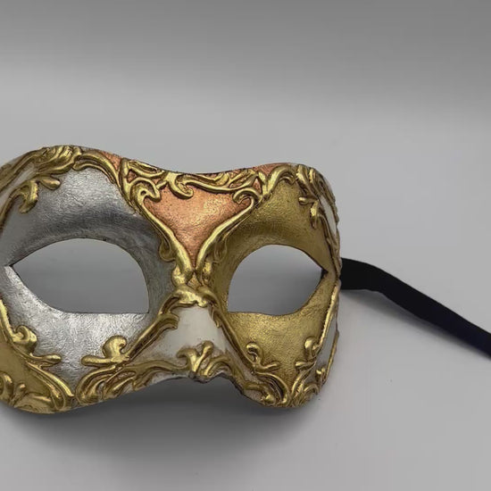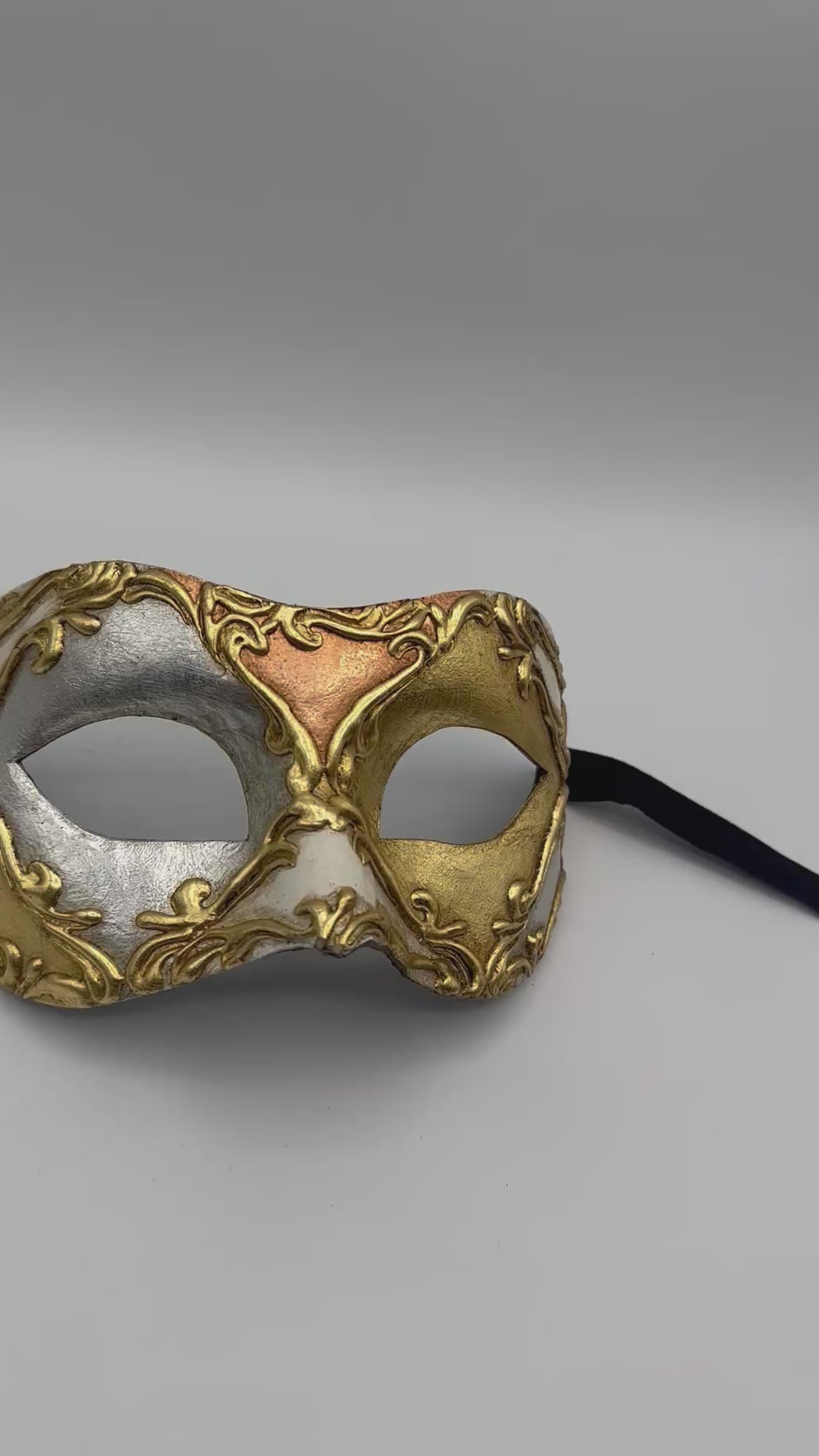 Esta máscara está finamente decorada con pintura de color cobre, plateado y dorado y tiene un cordón dorado muy bonito y una tiara. ¡Es una buena inversión!