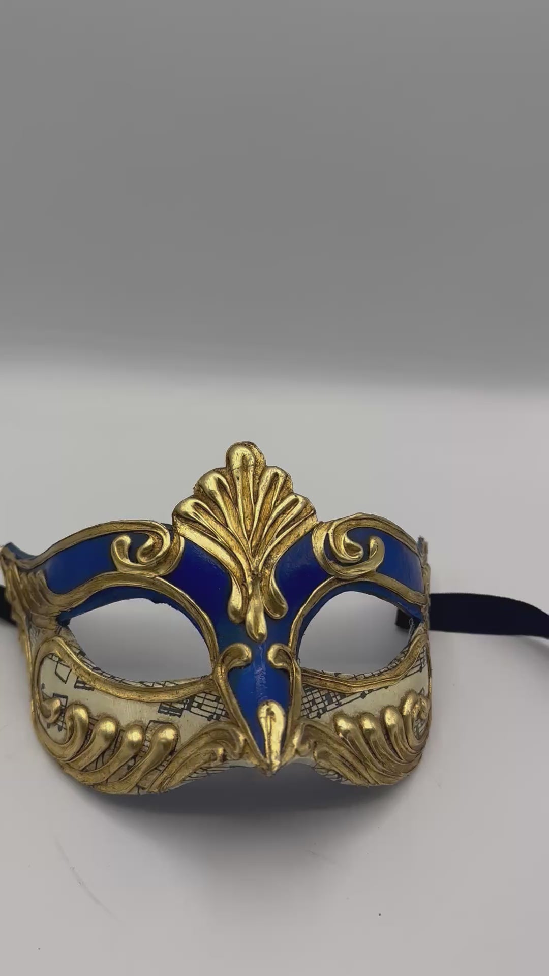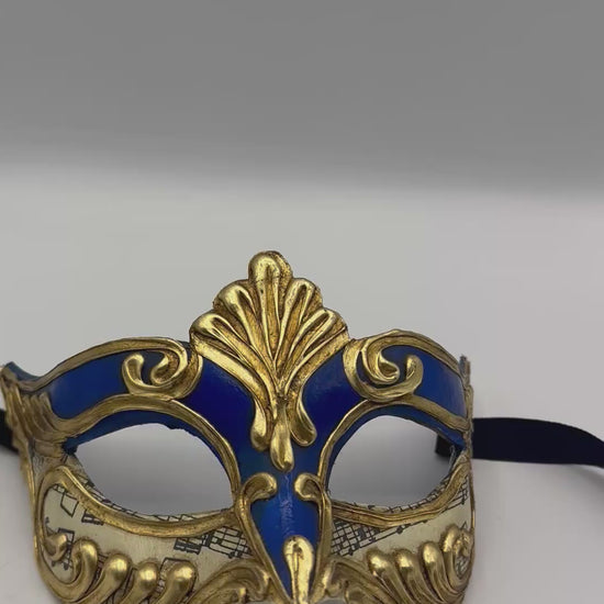 Masque loup vénitien en papier mâché avec des lignes ondulées dorées et des notes de musique. Ce masque loup a une coupe très droite et est aussi très apprécié par les hommes.