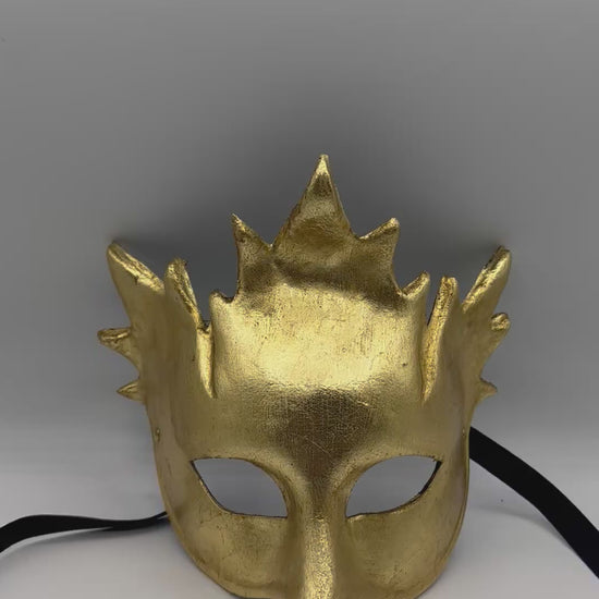 Dit gouden Bacchus masker heeft de vorm van een wijn-blad. Bacchus staat symbool voor de Wijn, en die schenkt hij overvloedig aan allen die met hem het leven willen vieren. Hiermee brengt hij een ode aan de fertiliteit van Moeder aarde en een lofzang op het organische leven. Voor Bacchus is een feest dan ook pas echt geslaagd, indien hij alle gasten tot hun orgiastisch hoogtepunt heeft weten te brengen. Tot op de dag van vandaag wordt een orgie ook wel een Bacchanaal genoemd.