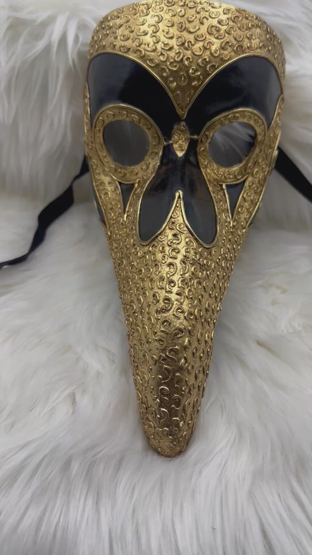 Elk masker is met de hand gemaakt van papier-maché, met oog voor detail en afwerking. De verfijnde barokdetails en lange snavel geven het masker een klassiek, indrukwekkend karakter.