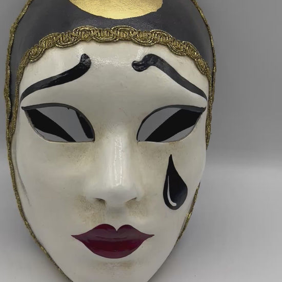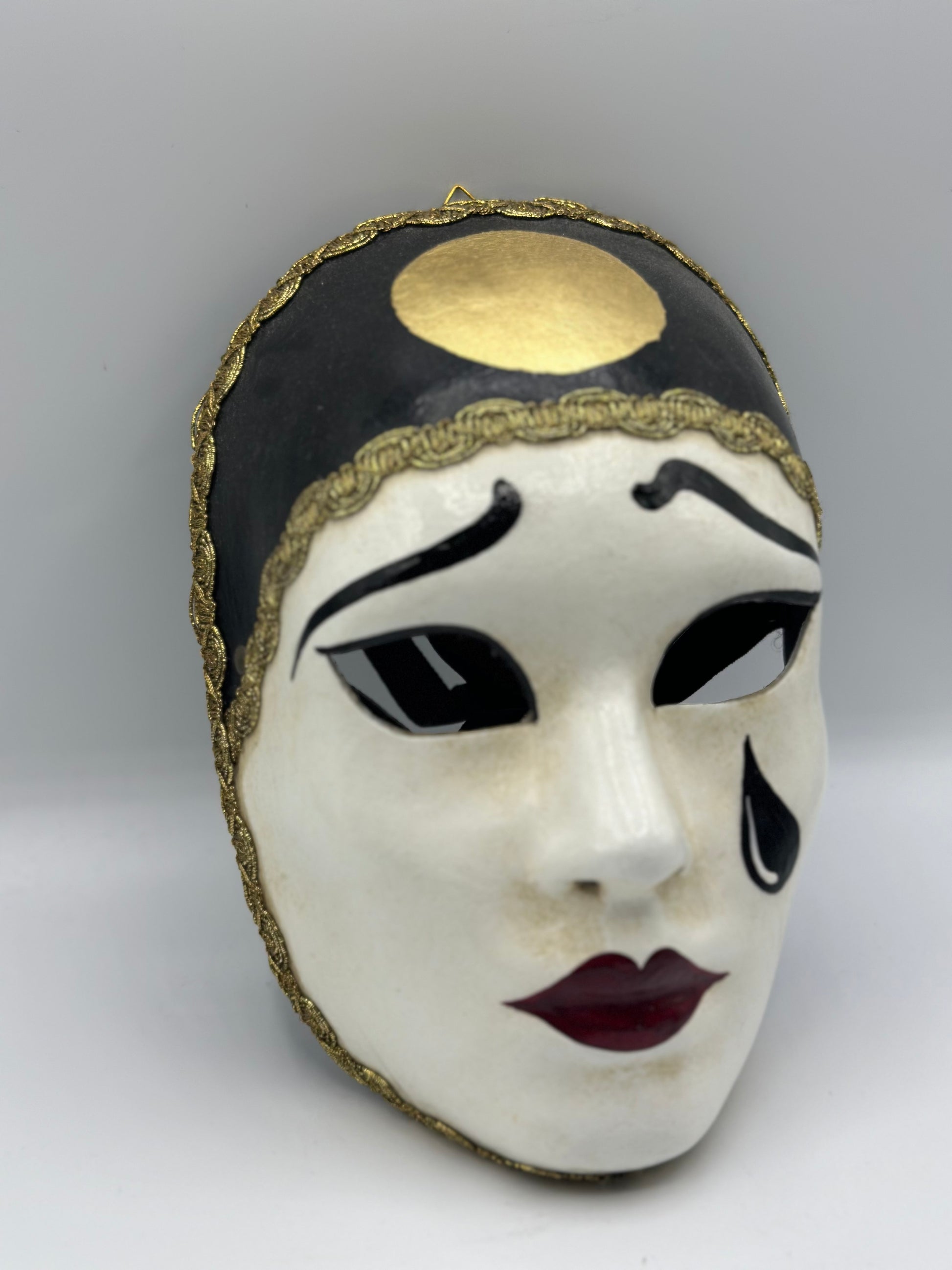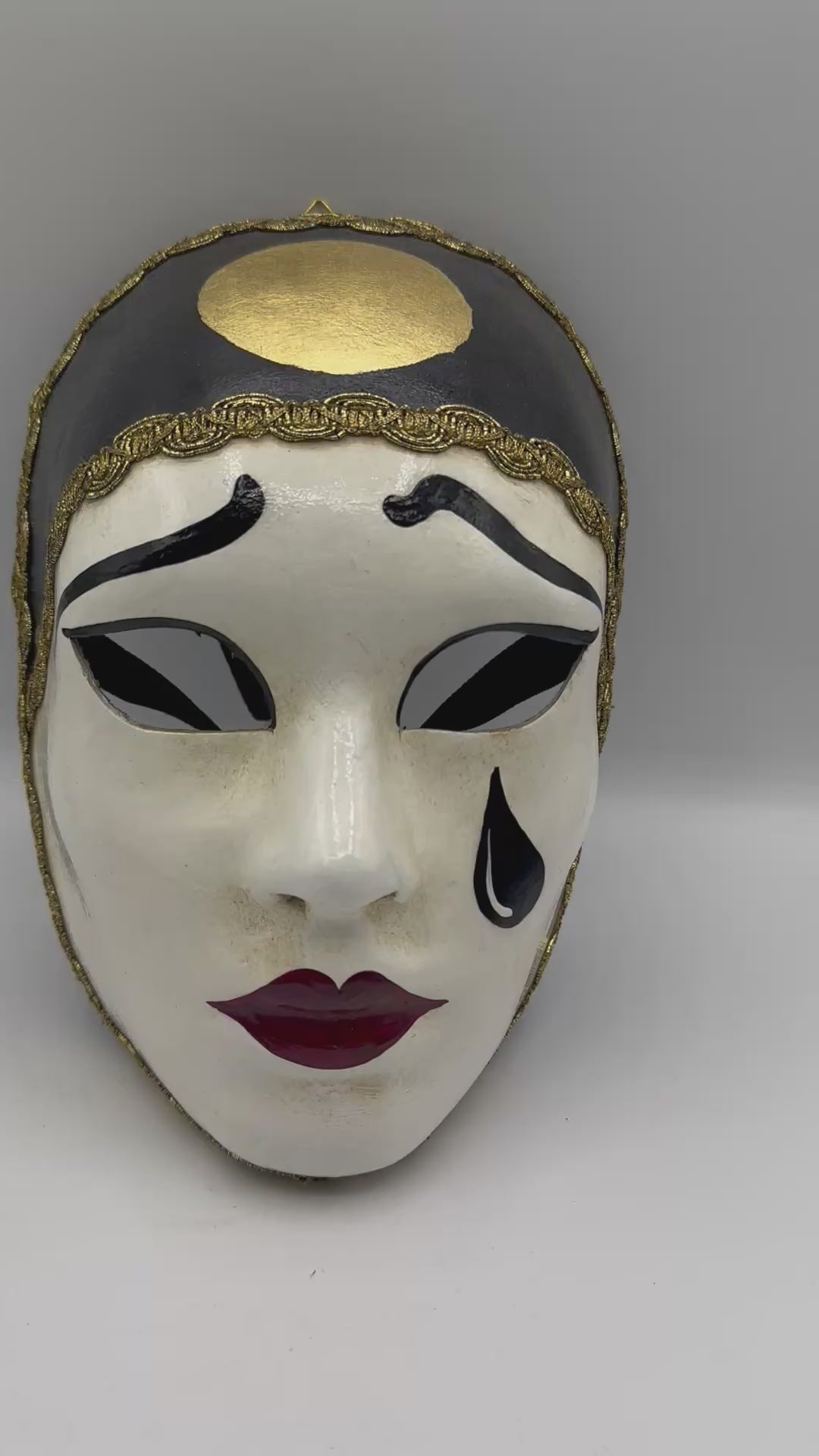 Diese verstillte Maske von Pierrot ist auf eine ganz besonders feine Art bemalt. Pierrot ist ein schweigsamer Pantomimencharakter aus der Commedia dell'arte, ein trauriger Clown, weil das Mädchen, das er liebt, mit Harlekin durchgebrannt ist. Seine pantomimischen und dichterischen Künste sind ein Ausdruck seines gebrochenen Herzens.